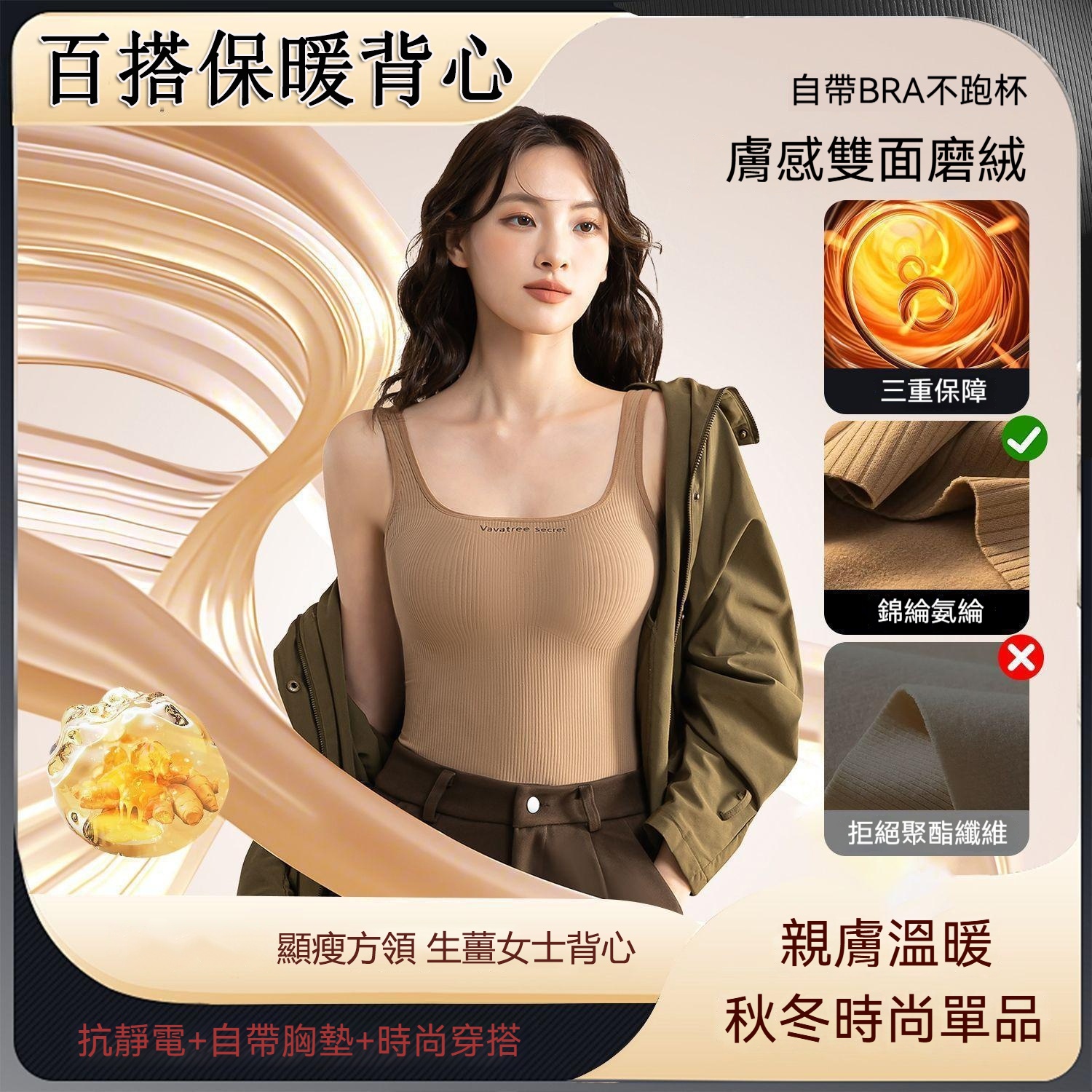 秋冬新款 生薑保暖女士背心 發熱無痕內衣 修身帶胸墊 打底防寒上衣 內搭外穿遮副乳